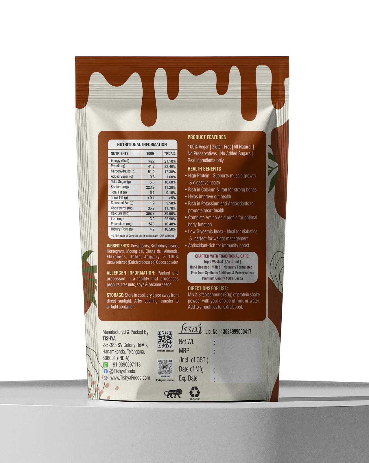 Pure Goodness Inside: Soya Beans • Red Kidney Beans • Horsegram • Moong • Chana • Soya Beans • Flaxseeds • Almonds • Dry Dates • Jaggery • 100% Unsweetened dutch processed Cocoa powder